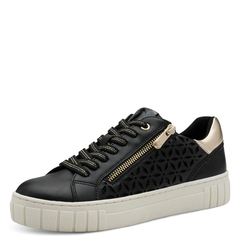 pohodlné módní tenisky na podrážce 4 cm, technologie VEGAN, vyjímatelná měkká stélka z paměťové pěny, měkká podšívka, rychlé obouvání pomocí zipu, šíři lze regulovat tkaničkami, velikost odpovídá, barva černá se zlatými doplňky