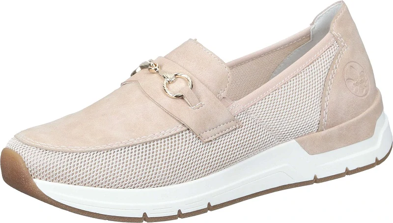 Dámské polobotky značky Rieker Německo, módní mokasíny sportovního vzhledu na zvýšeném klínu 3,2 cm, technologie ANTISTRESS, vyjímatelná zdravotní stélka z paměťové pěny, velikost odpovídá, barva pudrová celý popis