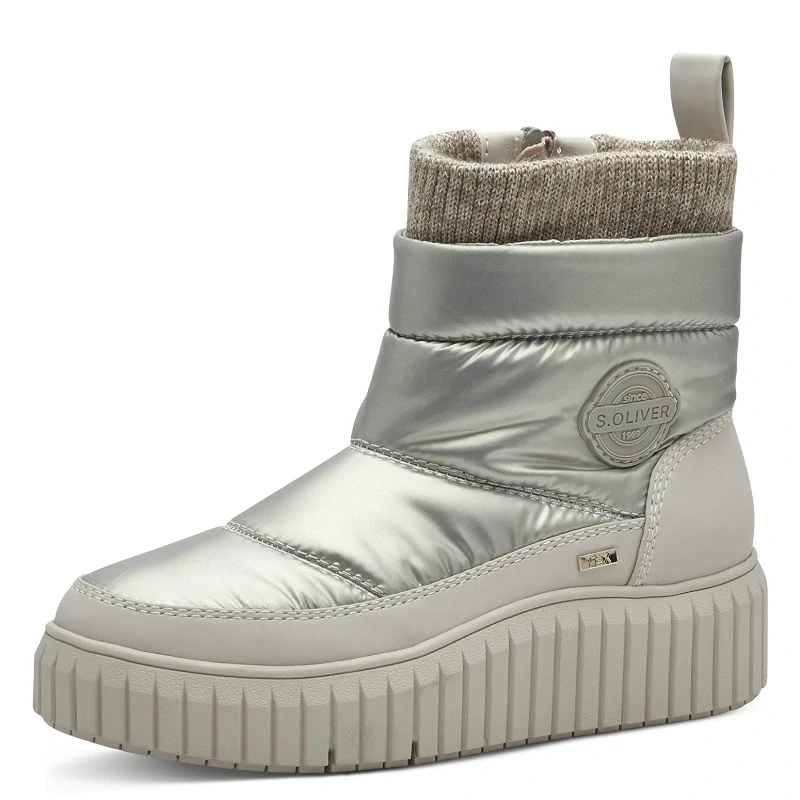 Dámská zimní obuv značky s.Oliver Německo, módní sněhule na klínu 4,5 cm s platformou, membrána - TEX MEMBRANE, zateplené plyšem, stélka z paměťové pěny - SOFT FOAM, obouvání pomocí zipu, velikost odpovídá, šíře střední, barva světle zlatá s béžovou celý popis