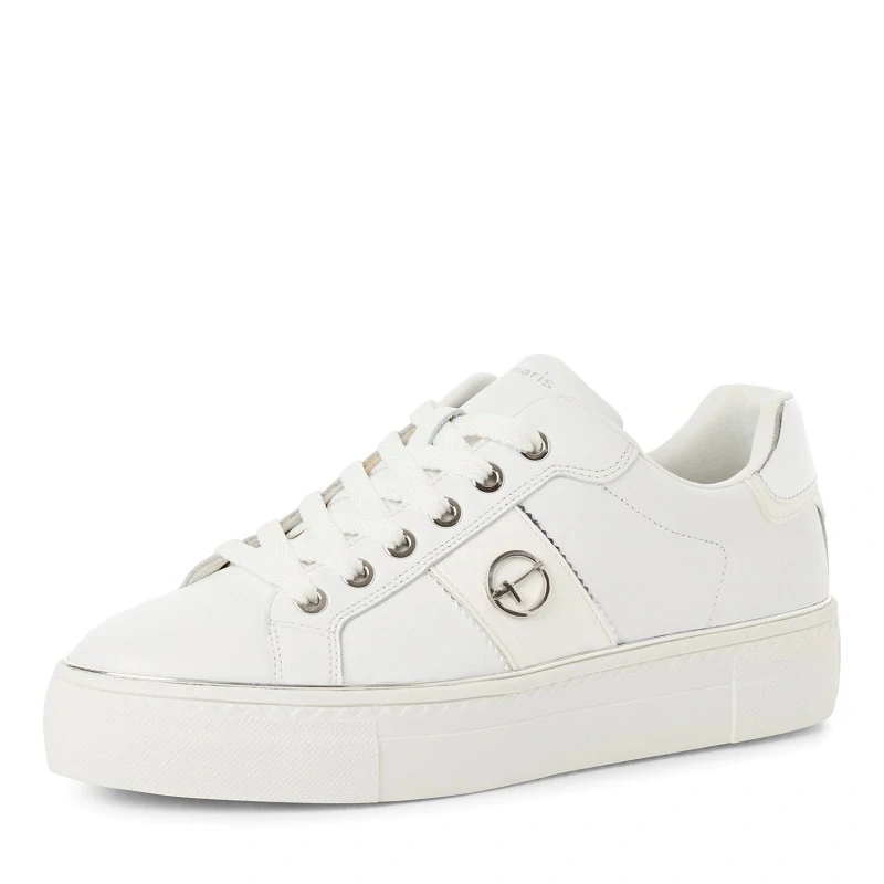 Dámská obuv značky Tamaris Německo, módní kožené tenisky na podrážce 3,5 cm, vyjímatelná stélka z paměťové pěny, šíři lze regulovat tkaničkami, velikost odpovídá, barva bílá celý popis