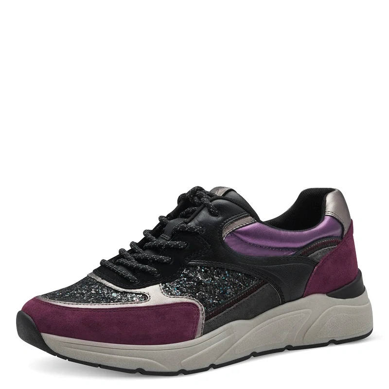 Dámská obuv značky Tamaris Německo, módní pololobotky sportovního vzhledu na klínu 5 cm, technologie VEGAN, vyjímatelná měkká stélka z paměťové pěny - technologie TOUCHIT, šíři lze regulovat tkaničkami, velikost odpovídá, barva fialová s černou celý popis