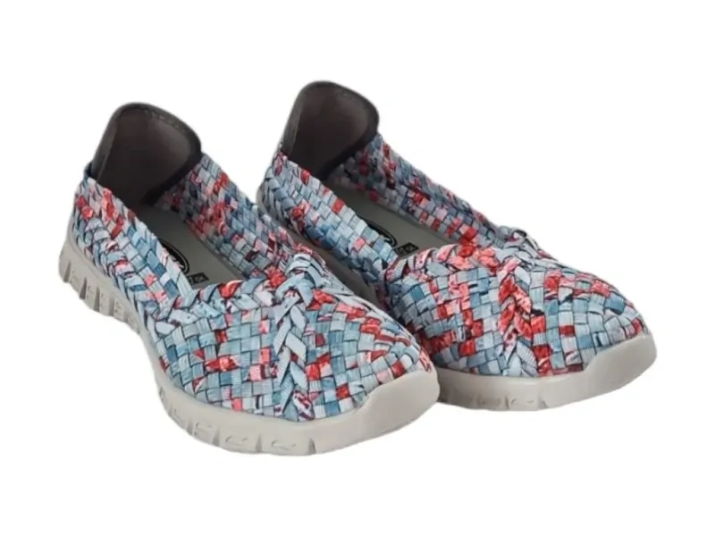 pohodlná gumičková obuv, spletená z textilních gumiček, přizpůsobí se každé noze, stélka z paměťové pěny, velikost odpovídá, při znečištění lze šetrně prát na 30°C, barva modrá s červenou