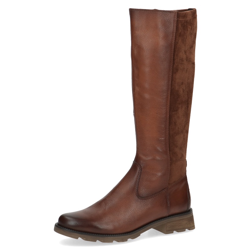 kožené kozačky na nízkém pohodlném podpatku 4,5 cm, vyjímatelná speciální stélka - CAPRICE AIRMOTION, velikost odpovídá, strečový materiál přes lýtko, šíře střední, barva přírodní hnědá