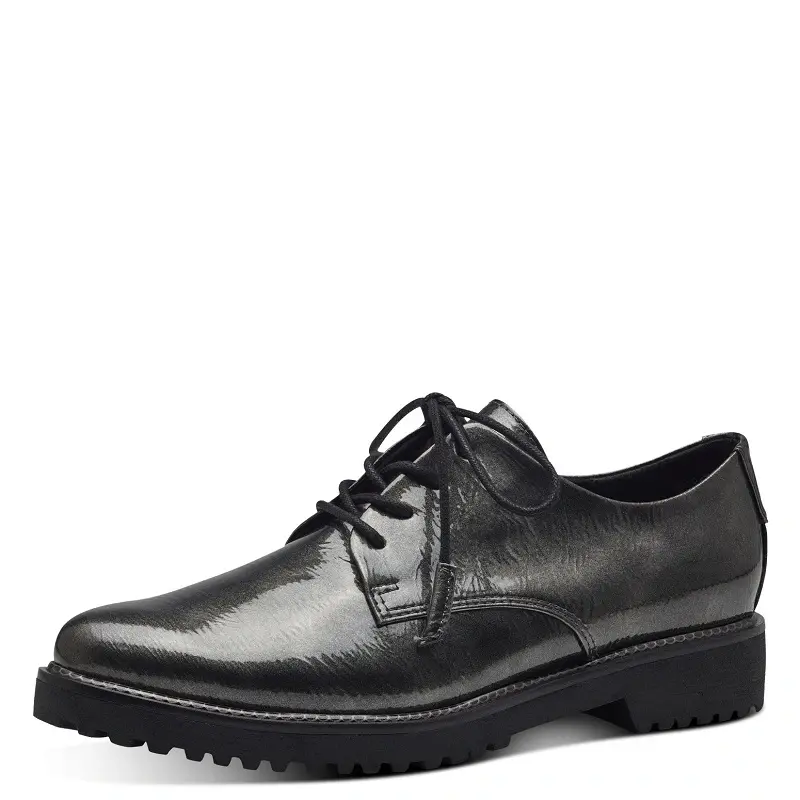 Dámská obuv značky Marco Tozzi Německo, pohodlné módní polobotky na nízkém podpatku 3,5 cm, technologie VEGAN SHOES, šíři lze regulovat tkaničkami, měkká stélka z paměťové pěny - Feel me, velikost odpovídá, lesklý materiál, barva kovová celý popis