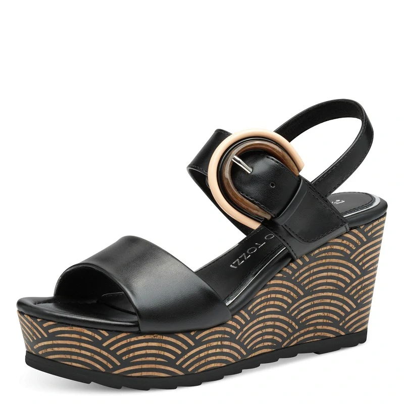 Dámská obuv značky Marco Tozzi Německo, módní sandály na vyšším klínu 8 cm, technologie VEGAN SHOES, komfortní vyměkčená stélka z paměťové pěny - technologie FEEL ME, velikost odpovídá, zapínání na přezku, barva černá celý popis