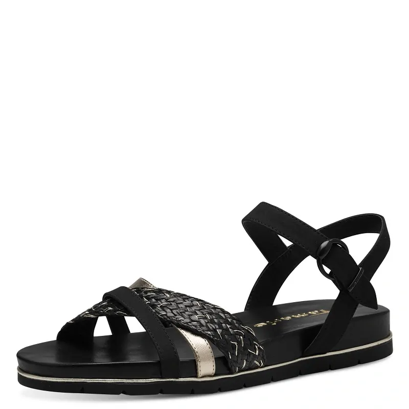 Dámská obuv značky Tamaris Německo, módní sandály na klínu 2,5 cm, technologie VEGAN, komfortní vyměkčená stélka z paměťové pěny, velikost odpovídá, zapínání na suchý zip, barva černá se zlatou celý popis